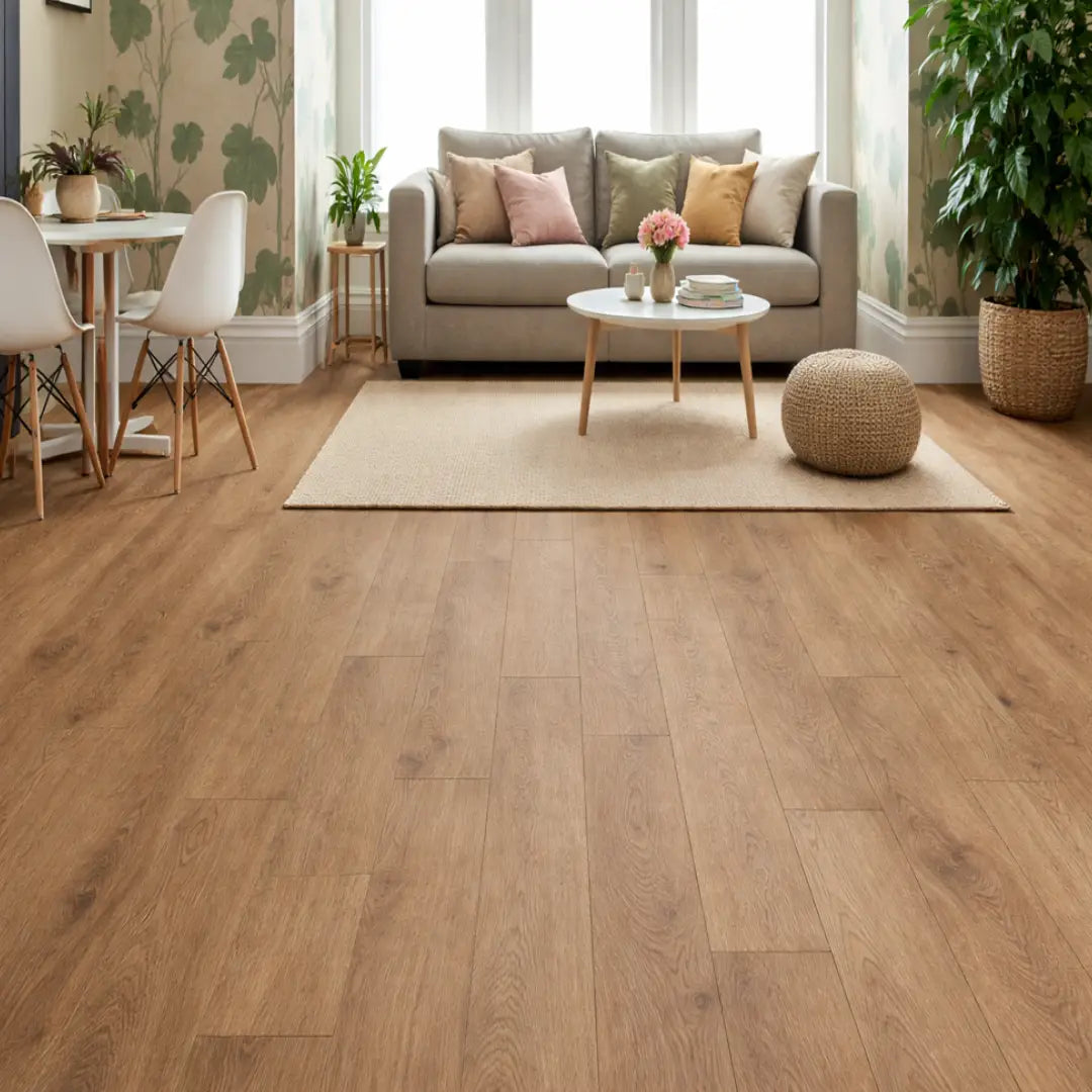 The neutral light oak colour works across a wide range of interiors and furniture styles, making it a practical choice for buyers searching for light oak laminate flooring UK, durable laminate flooring for modern homes, and easy-install click flooring suitable for residential and light commercial use.